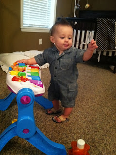 He keeps his mommy BUSY!! He takes 2 naps a day-maybe 15 minutes a piece. He is EVERYWHERE & I'm constantly running after him or pulling him down from climbing.